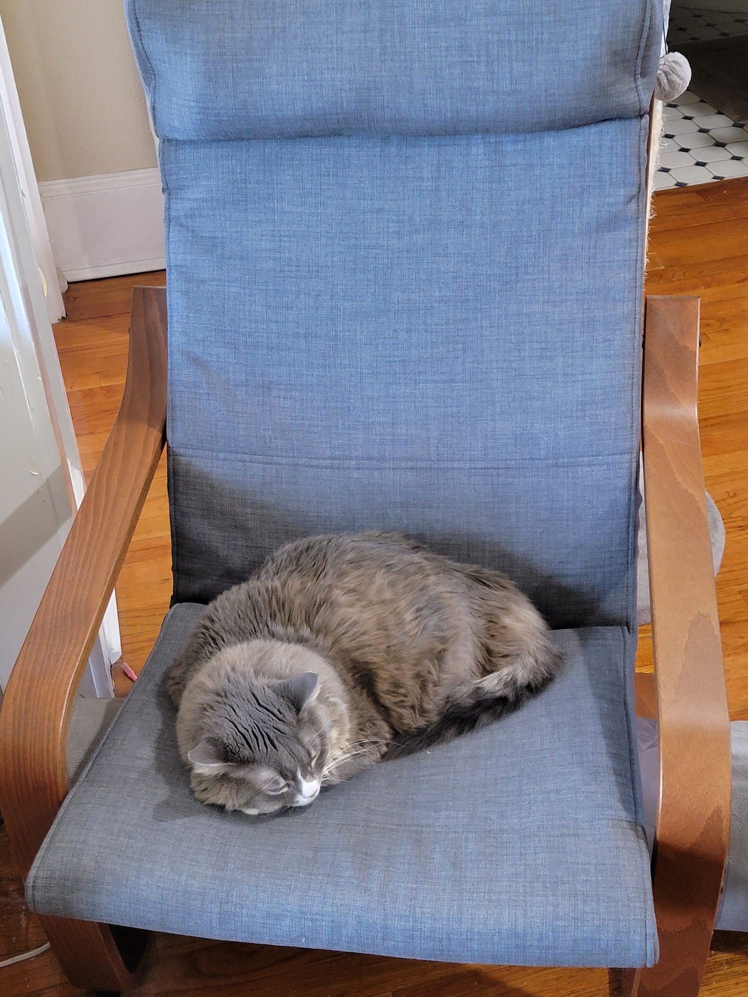 I've had an IKEA Poang chair for 11 years. I love it because it supports my head. Unfortunately, after washing the cushion cover and stuffing the cushion back into it, the piping around the front of the cushion sticks right up into my legs. It’s fine some of the time, but definitely not when there's a 14-pound cat on my legs for long periods of time. The rest of the cushion is still very comfortable, but it is old and kind of dingy-looking.
