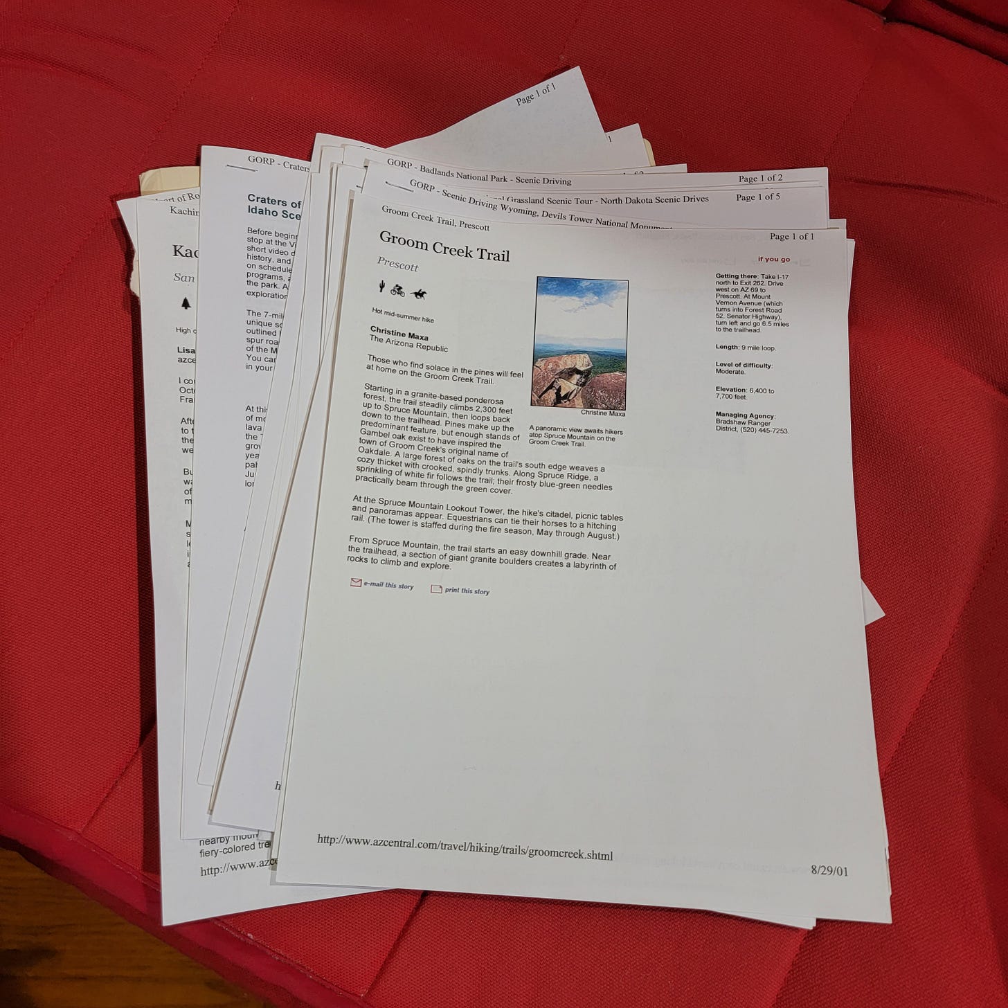 This is a pile of printouts from the internet I've kept since 2001. They are all about places across the country I wanted to go on an epic road trip. My husband and I bought a van with which to take this road trip, but then he changed his mind, and we sold the van. It was probably then that I knew we would not stay together. I wanted to see the world, b…