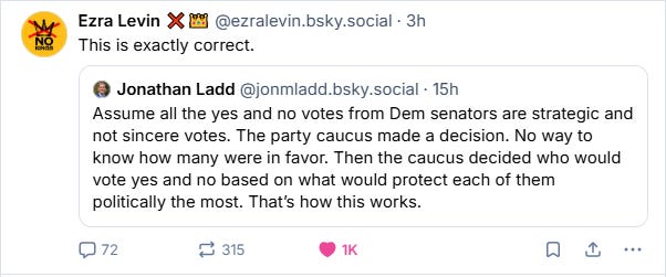 Democrats - who I used to think were the party that was looking out for me - let eight of their members go rogue and throw the healthcare premium tax credits under the bus. They threw working-class Americans under the bus. Why? Who knows. But Chuck Schumer orchestrated it, and it was likely to appease his wealthy donors. He, himself, voted no on the bad deal to save his own ass. But he did it. He allowed a group of less vulnerable Democrats to make believe that Republicans can be trusted with the welfare of working-class Americans, people they've made it pretty clear that they don't give a shit about.